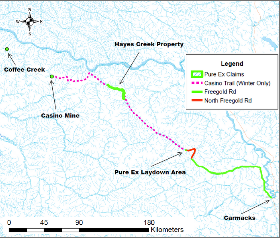 The property is strategically located near two of Canada’s largest undeveloped copper-gold resources: 35 km east of Western Copper and Gold Corporation’s Casino porphyry deposit and 65 km east of Newmont Corporation’s Coffee gold deposit. Additionally, a government-led infrastructure project will extend the Casino Road along the property’s southern boundary, connecting it to the provincial road network. Currently, the property is only accessible by helicopter or fixed-wing aircraft from Dawson City and Whitehorse. Logistical support for the transport of materials and heavy equipment is provided by a 60 km seasonal ice road extending from a laydown area near Carmacks.
