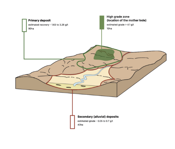 The Kamaha Gold Project is situated within the Archean Loko Group greenstone belt, a supracrustal sequence of metamorphosed volcanic and sedimentary rocks that host numerous documented occurrences of gold mineralization in northwestern Sierra Leone. Mineralization at Kamaha is consistent with structurally controlled, orogenic lode-gold systems typical of Archean greenstone belts. The project encompasses multiple vertically oriented quartz–carbonate vein systems containing high-grade gold mineralization. The existing claim area hosts a high-grade deposit, interpreted to represent the primary lode. Furthermore, geological surveys have identified a 90-hectare area adjacent to the current site with significant gold potential, indicating that systematic exploration could materially expand the existing resource base.